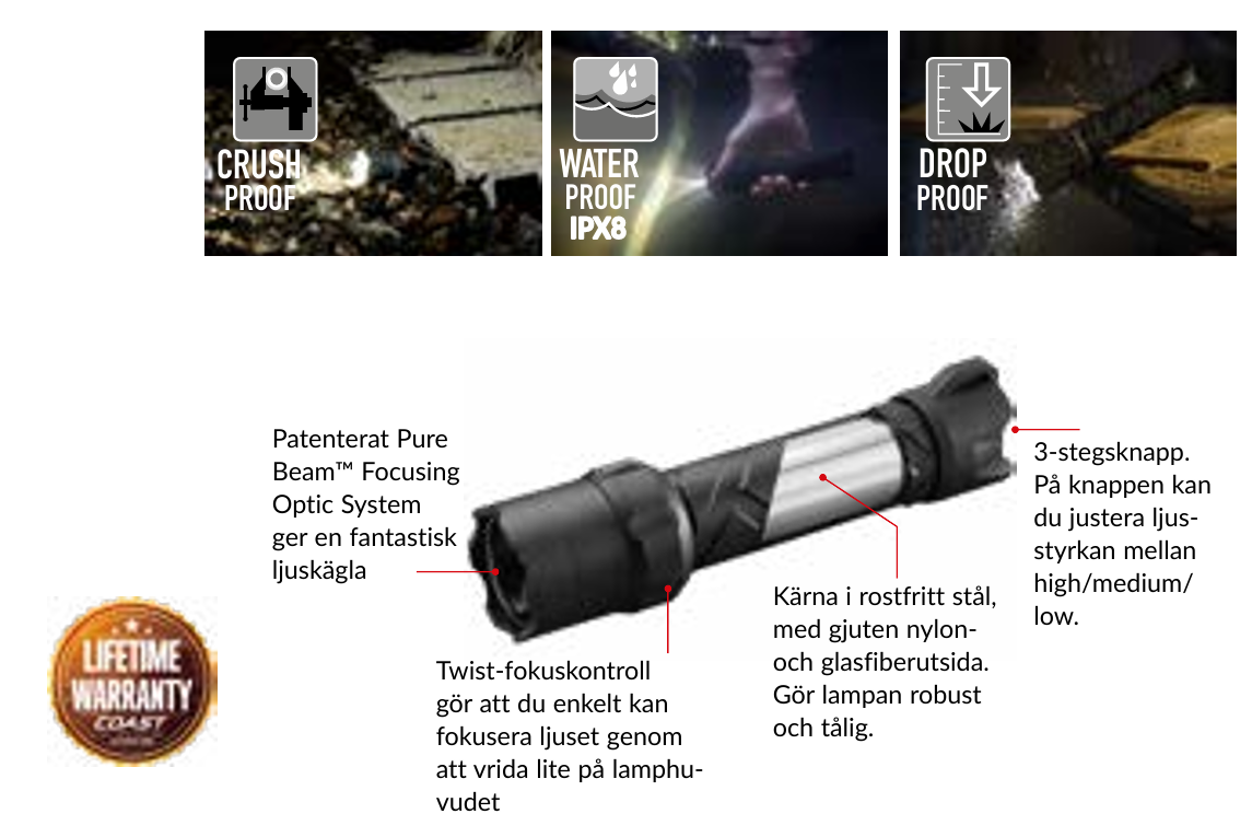 COAST:s patenterade Pure Beam Focusing Optic System ger överlägsen strålintensitet. När du ställer in ljuset från den fokuserade ljuskäglan (Spot) till den breda ljuskäglan (Flood) får du inte de mörka ringarna som annars är typiska för ficklampor som kan göra fokuserade ljuskäglor.