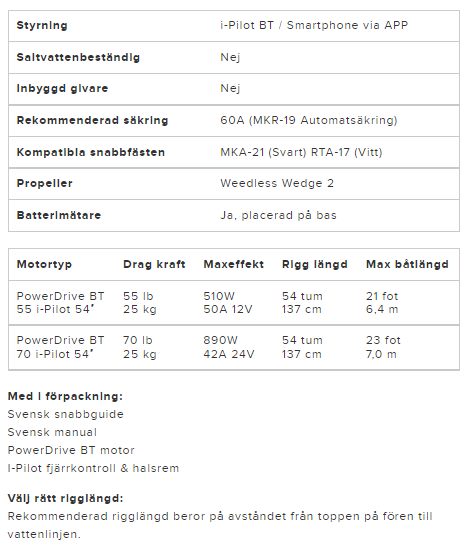 Motormodellen finns även som även som saltvattenbeständig och går då under namnet Riptide PowerDrive BT IP. En batteriindikator finns monterad på motorfästet för enkel avläsning genom en knapptryckning. PoweDrive BT har steglös varvtalsreglering och digital Maximizer för längre driftstid.