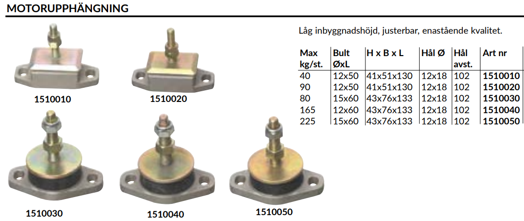 När du beräknar vilken upphängning som ska användas, tänk på var centrumvikten i motorn är placerad.. Ofta behövs 2 set med olika hårdhet. Inkludera hela installationens vikt inkl. olja och vatten, välj hellre lite för mjuk än för hård upphängning.