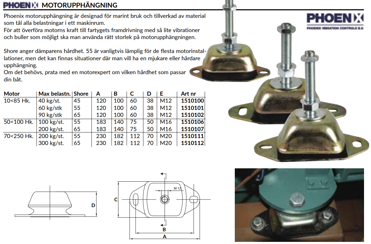 Phoenix motorupphängning är designad för marint bruk och tillverkad av material som tål alla belastningar i ett maskinrum.